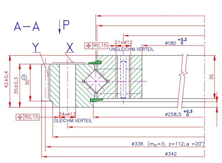 Łożysko wieńcowe 9E-1Z14-0254-0110 z uzębieniem zewnętrznym o średnicy 342 mm z zębami prostymi z=112 o module m=3 przeznaczone do różnych aplikacji przemysłowych. Charakteryzuje się przenoszeniem dużych obciążeń osiowych o wartości: 260 kN i momentów wywrotowych 17 kNm. Odpowiednia konstrukcja umożliwia zastosowanie produktu w aplikacjach nisko i wysokoobrotowych.